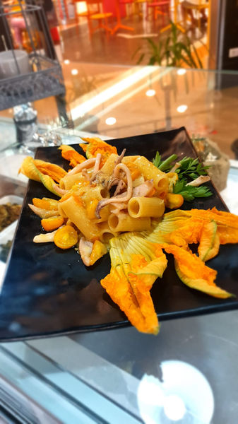 Scolare la pasta che avete messo a cuocere precedentemente, e aggiungerla con una manciata di fiori di zucca insieme al sugo di seppie e pomodorini gialli e saltate la pasta.